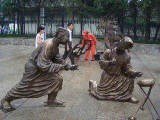 On the way from the north square to south square, you will find about four groups of copper statue. This one shows the scene how to make the sugar figures, which is also a traditional craftsmanship. When I was a child, I could buy one just for about RMB 1, but now it is very rare.